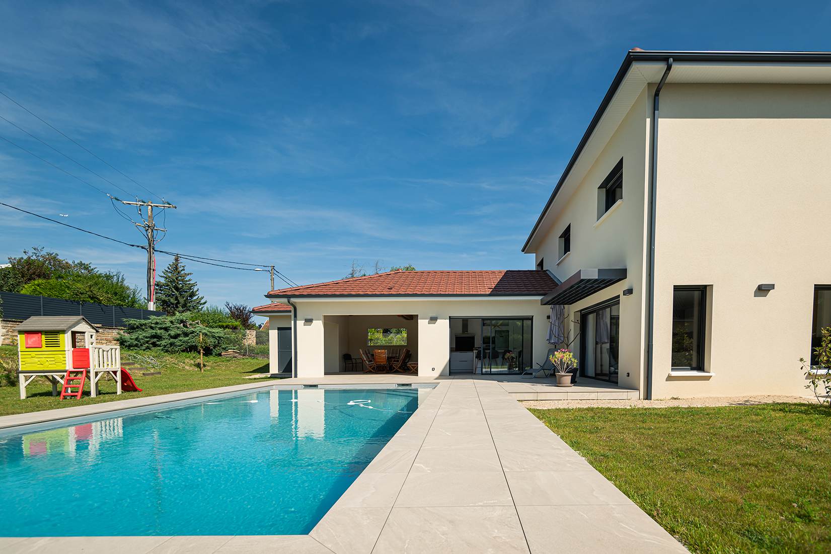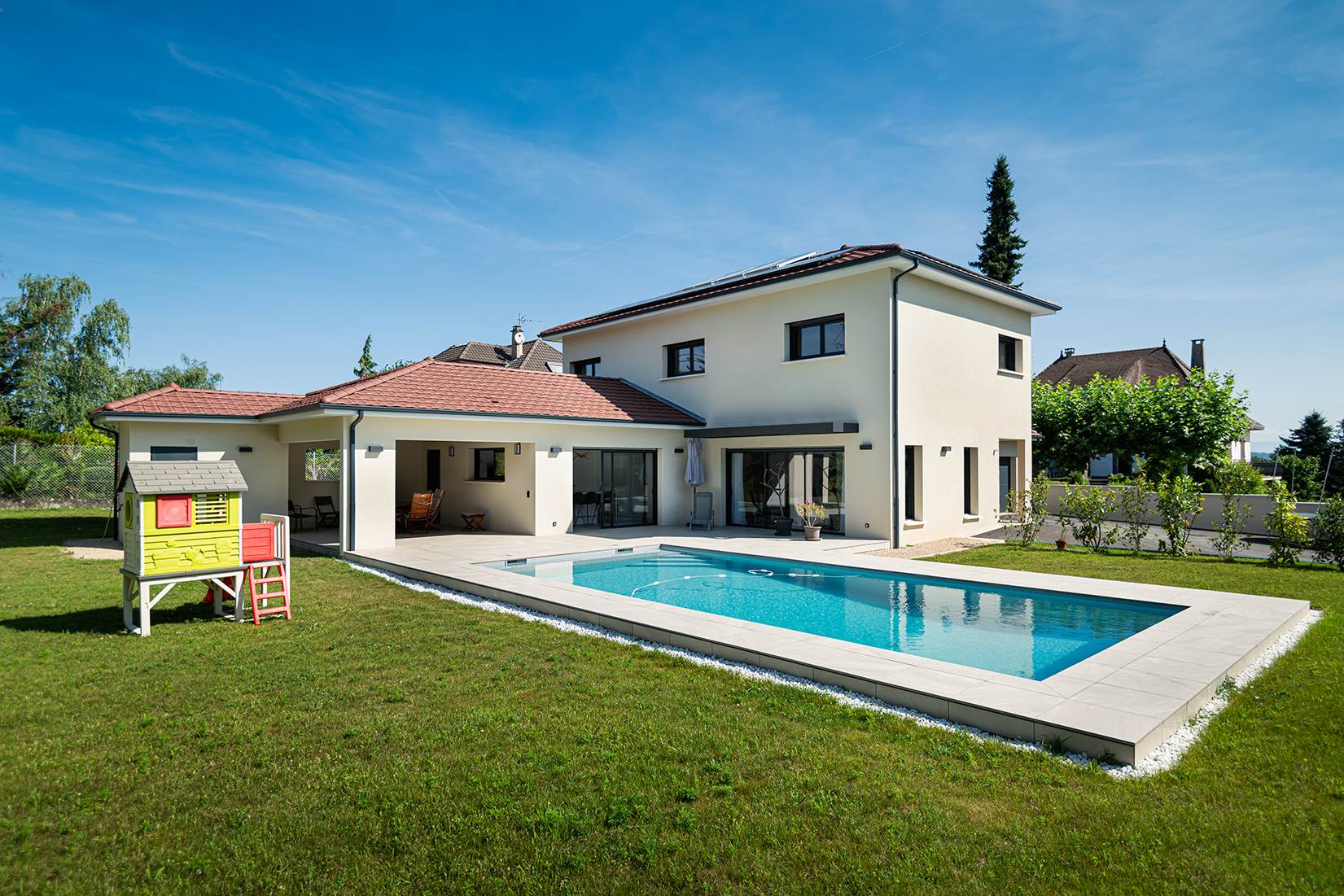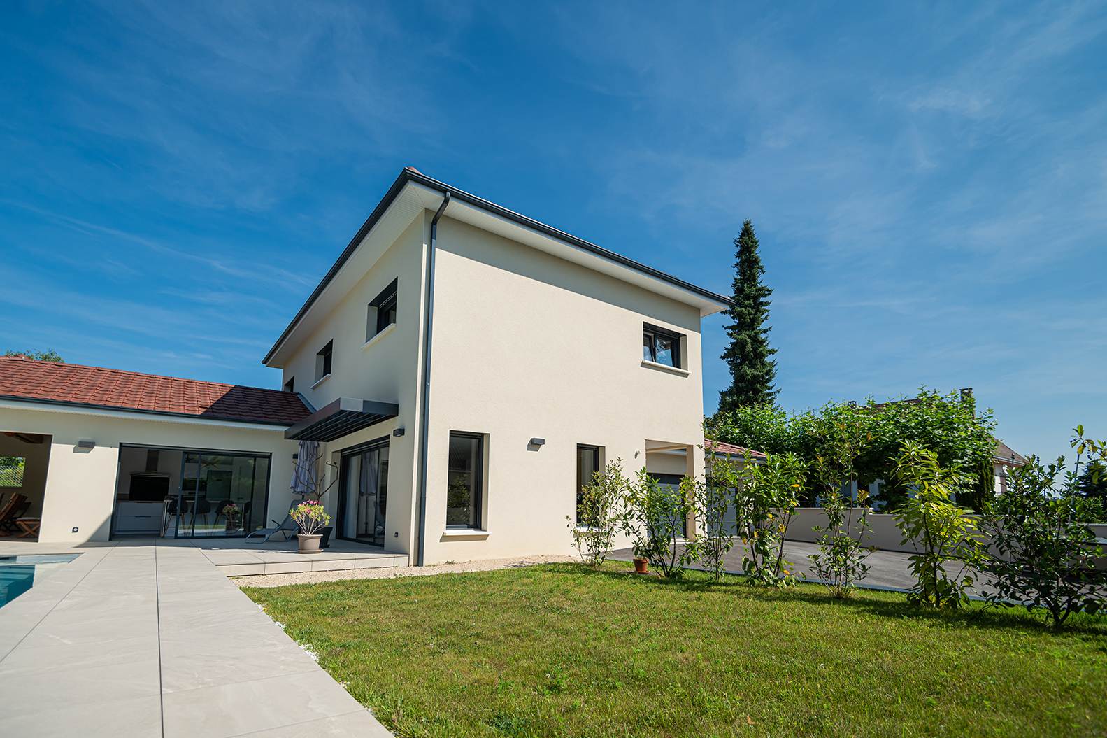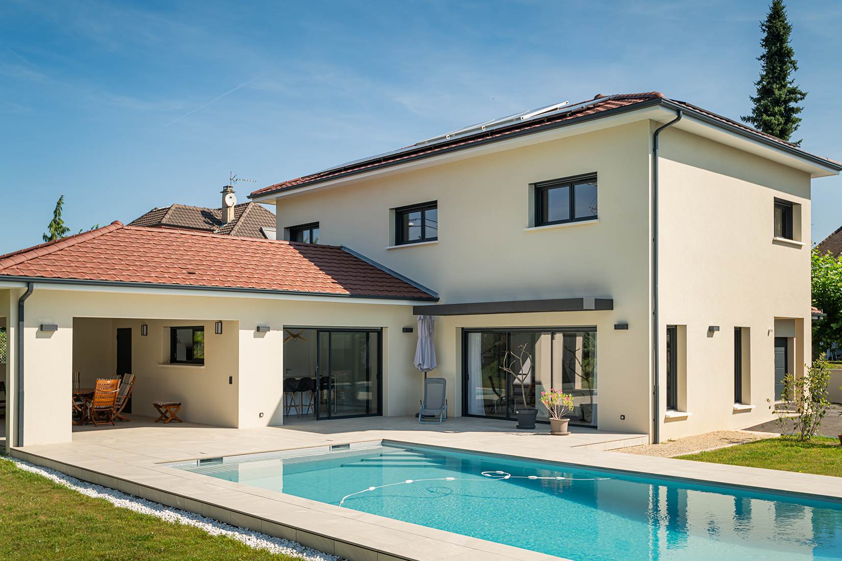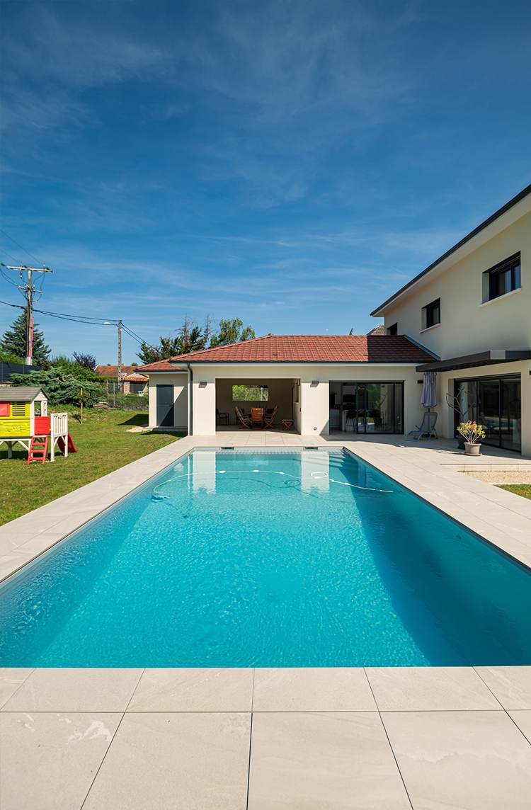 Ce projet de construction de maison individuelle compose une architecture qui apporte un grand confort de vie, une grande luminosité au sein de la maison et qui s’ouvre largement sur la vie extérieure. Les espaces sont généreux afin d’abriter une grande famille. Les nombreux rangements, tant au sein de la maison, avec les nombreux placards et pièces de rangements annexes, qu’à l’extérieur, à travers plusieurs locaux qui peuvent abriter le mobilier extérieur, garantissent un confort de vie pratique et paisible. Les nombreuses chambres et salles de bains permettent d’accueillir confortablement tous les habitants de cette maison y compris les occupants temporaires. Les volumes cette maison s’adaptent ainsi à ce terrain possédant une légère déclivité et optimisent au maximum les espaces de vie autant à l’intérieur qu’à l’extérieur. Les espaces annexes, tels que le garage et la terrasse couverte, sont également généreux de façon à répondre à tous les besoins. Le bassin de la piscine participe également à ce confort de vie et cette sérénité que propose cette architecture contemporaine.
