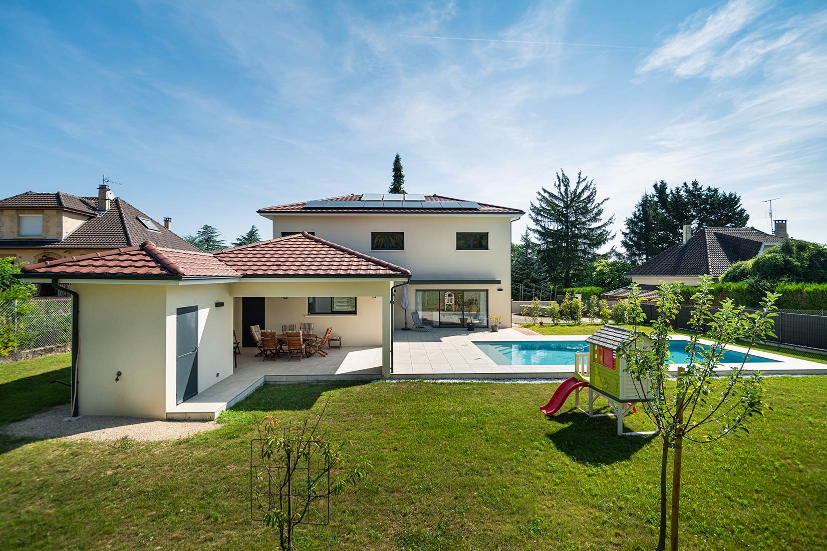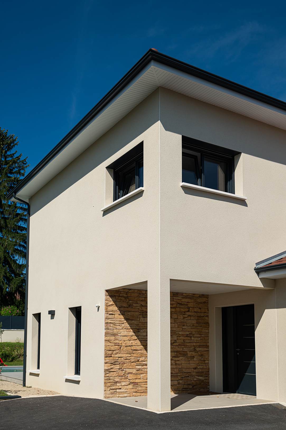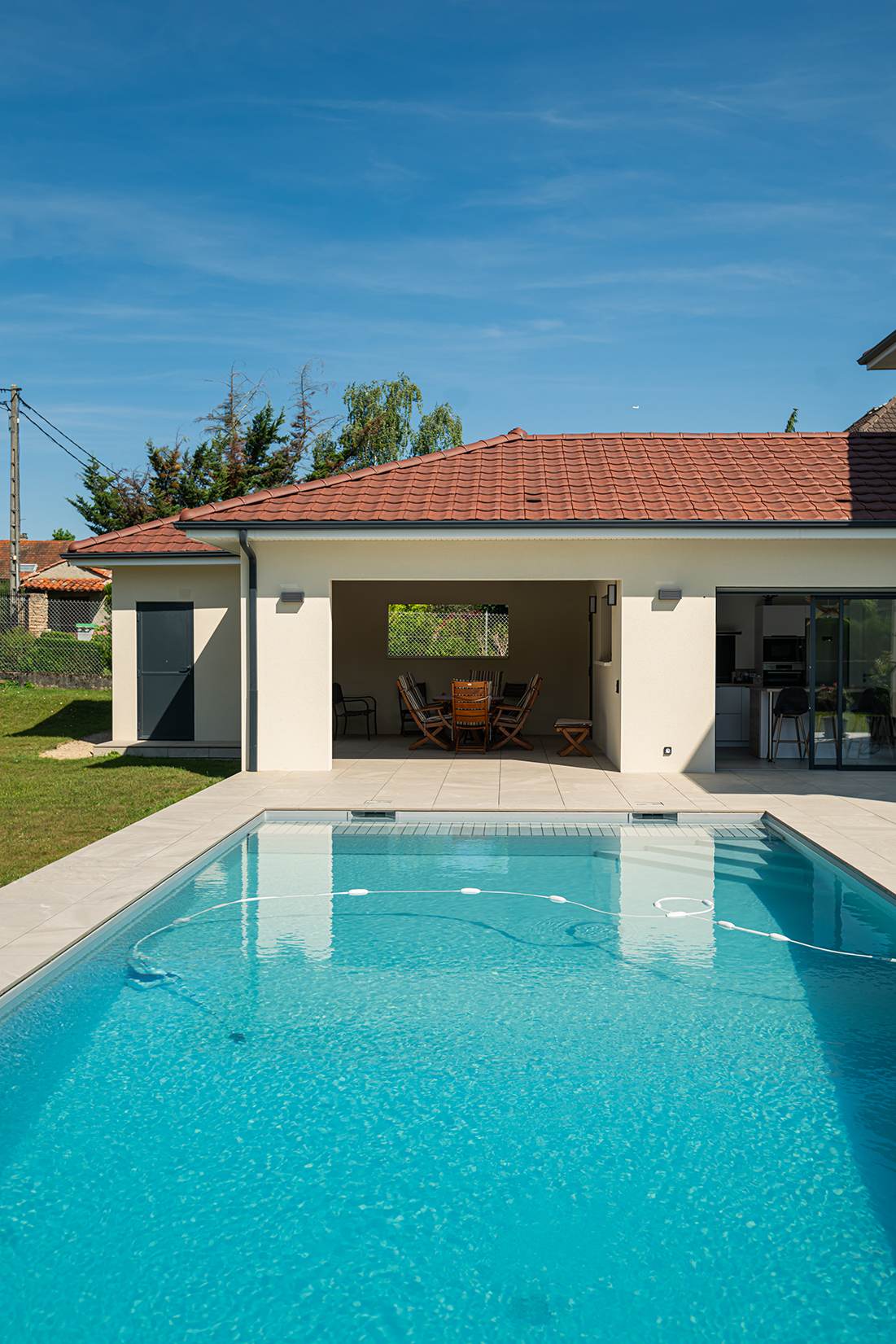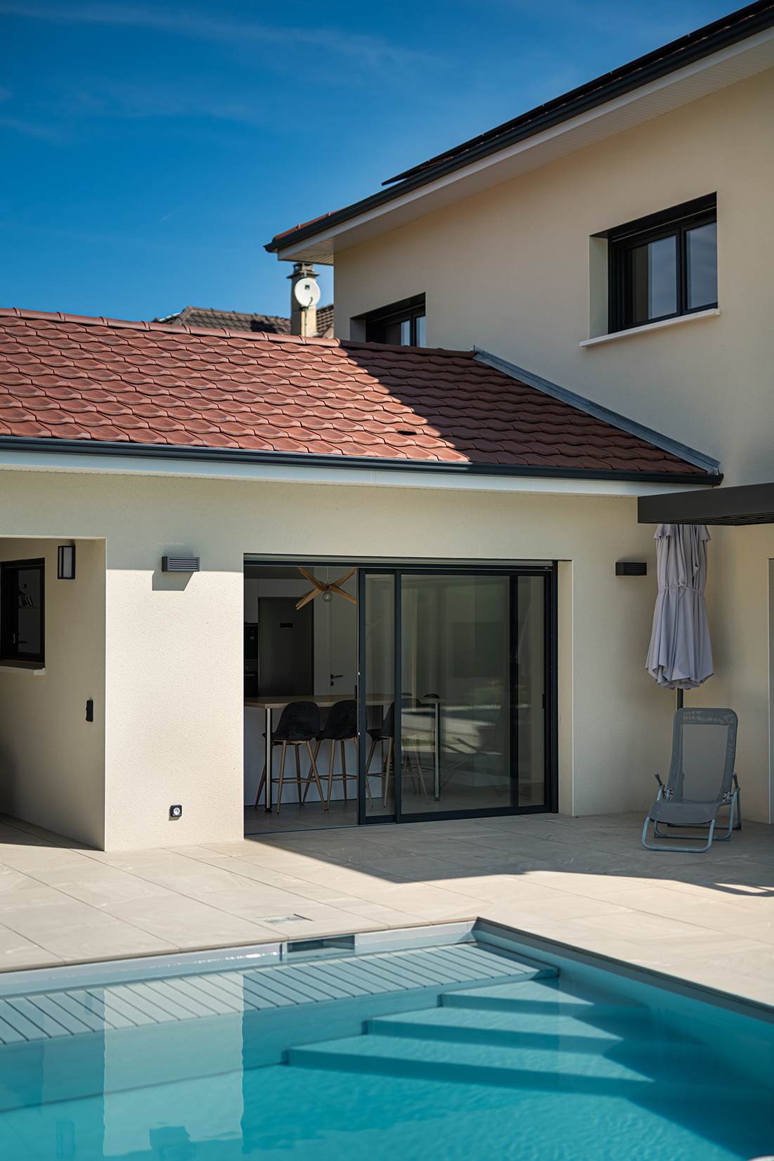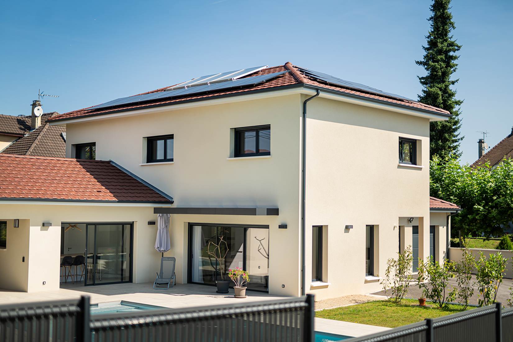 Ce projet de construction de maison individuelle compose une architecture qui apporte un grand confort de vie, une grande luminosité au sein de la maison et qui s’ouvre largement sur la vie extérieure. Les espaces sont généreux afin d’abriter une grande famille. Les nombreux rangements, tant au sein de la maison, avec les nombreux placards et pièces de rangements annexes, qu’à l’extérieur, à travers plusieurs locaux qui peuvent abriter le mobilier extérieur, garantissent un confort de vie pratique et paisible. Les nombreuses chambres et salles de bains permettent d’accueillir confortablement tous les habitants de cette maison y compris les occupants temporaires. Les volumes cette maison s’adaptent ainsi à ce terrain possédant une légère déclivité et optimisent au maximum les espaces de vie autant à l’intérieur qu’à l’extérieur. Les espaces annexes, tels que le garage et la terrasse couverte, sont également généreux de façon à répondre à tous les besoins. Le bassin de la piscine participe également à ce confort de vie et cette sérénité que propose cette architecture contemporaine.
