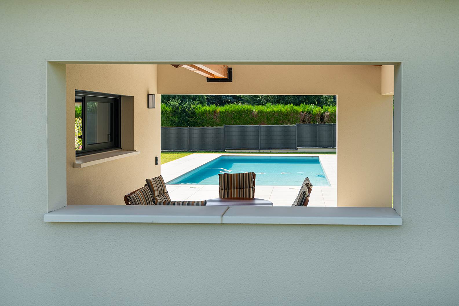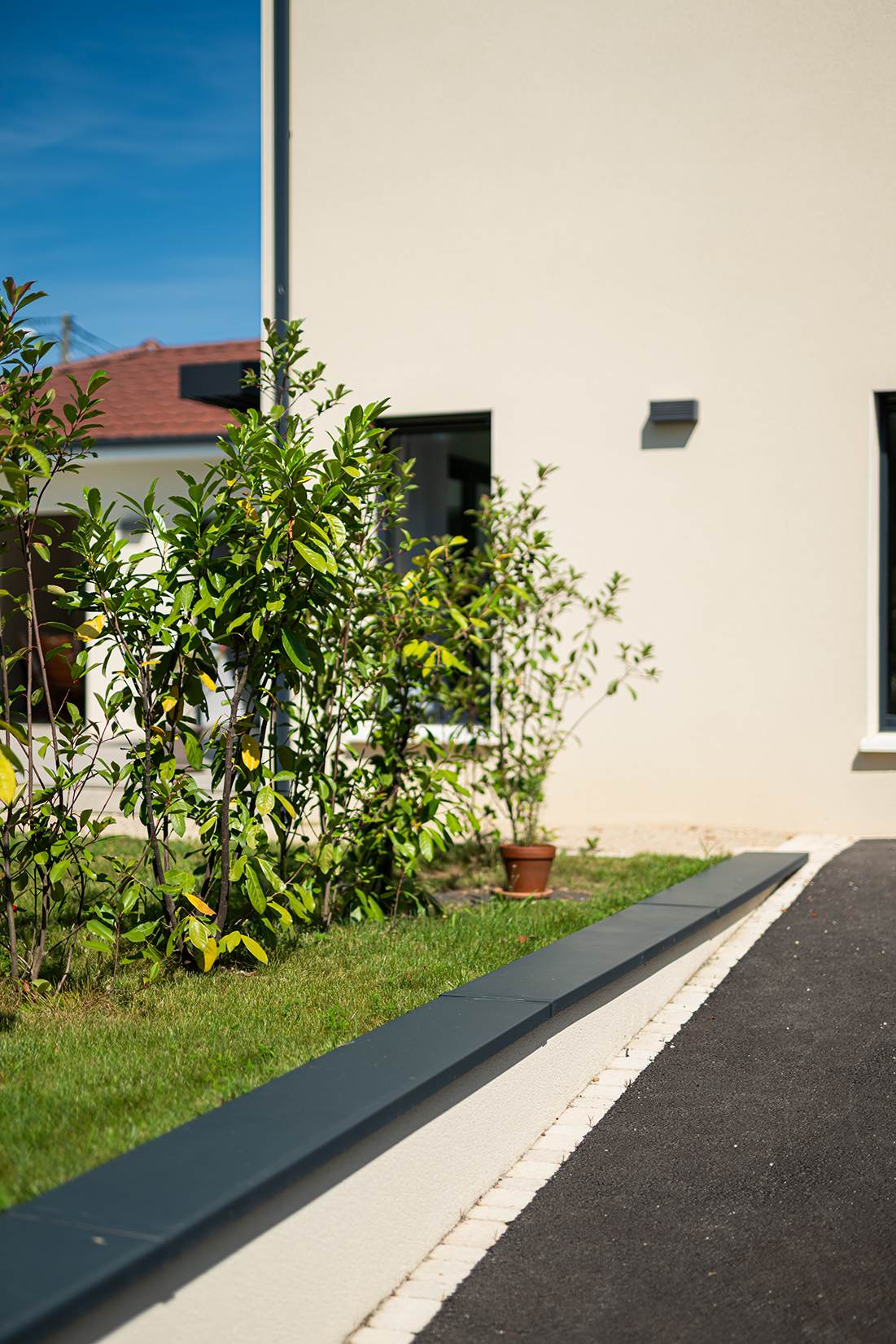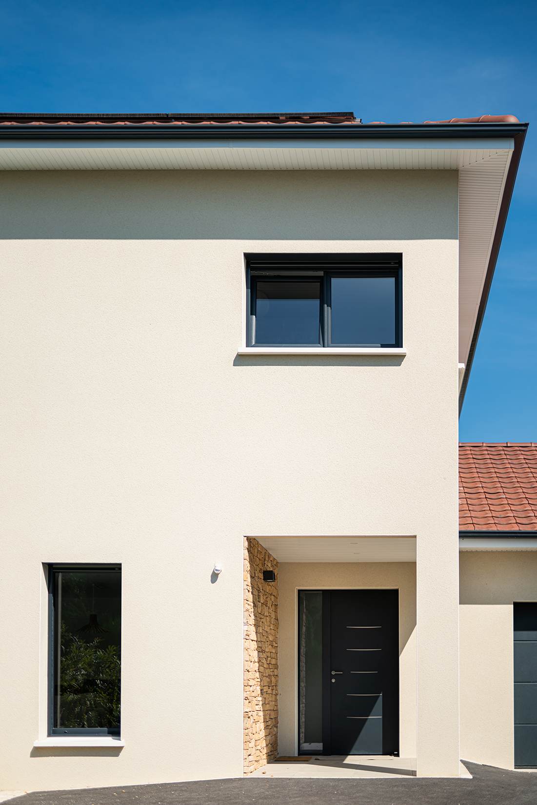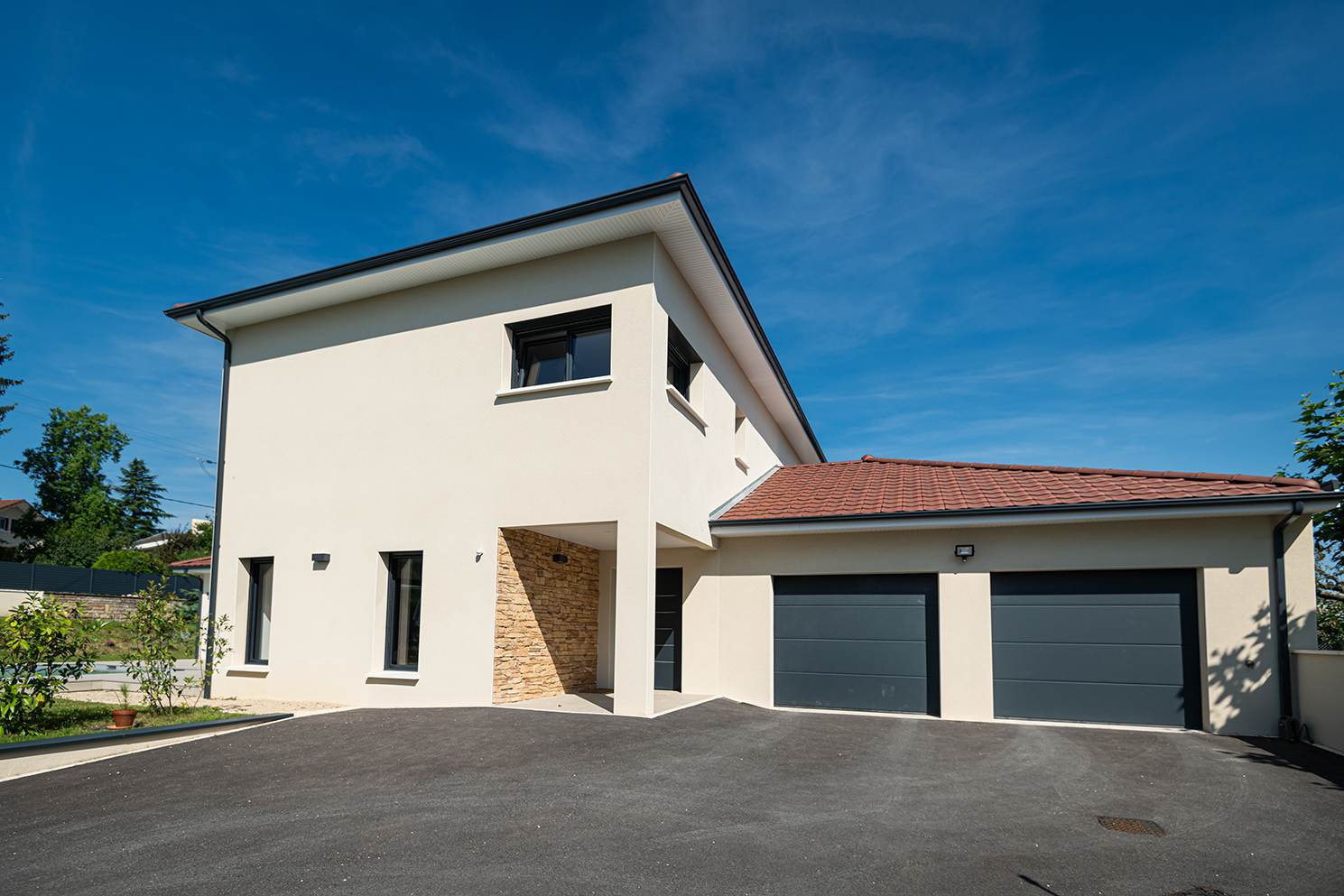 Ce projet de construction de maison individuelle compose une architecture qui apporte un grand confort de vie, une grande luminosité au sein de la maison et qui s’ouvre largement sur la vie extérieure. Les espaces sont généreux afin d’abriter une grande famille. Les nombreux rangements, tant au sein de la maison, avec les nombreux placards et pièces de rangements annexes, qu’à l’extérieur, à travers plusieurs locaux qui peuvent abriter le mobilier extérieur, garantissent un confort de vie pratique et paisible. Les nombreuses chambres et salles de bains permettent d’accueillir confortablement tous les habitants de cette maison y compris les occupants temporaires. Les volumes cette maison s’adaptent ainsi à ce terrain possédant une légère déclivité et optimisent au maximum les espaces de vie autant à l’intérieur qu’à l’extérieur. Les espaces annexes, tels que le garage et la terrasse couverte, sont également généreux de façon à répondre à tous les besoins. Le bassin de la piscine participe également à ce confort de vie et cette sérénité que propose cette architecture contemporaine.
