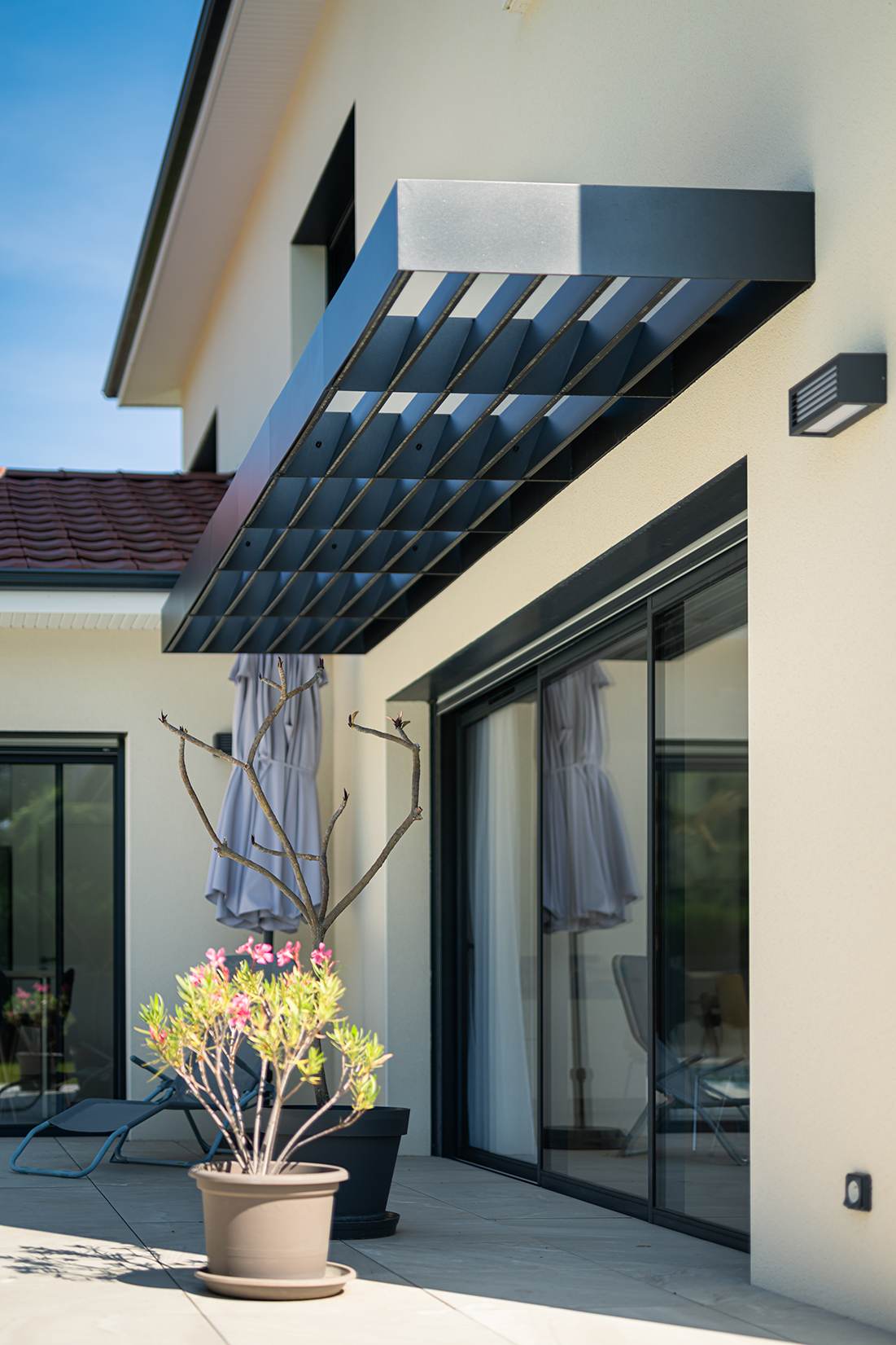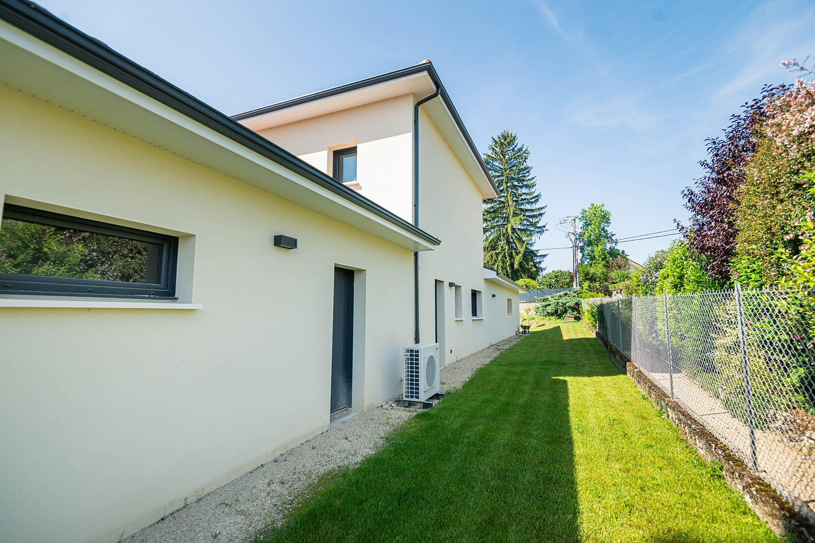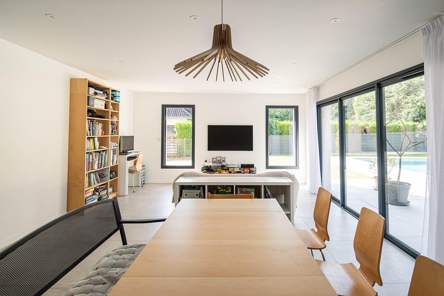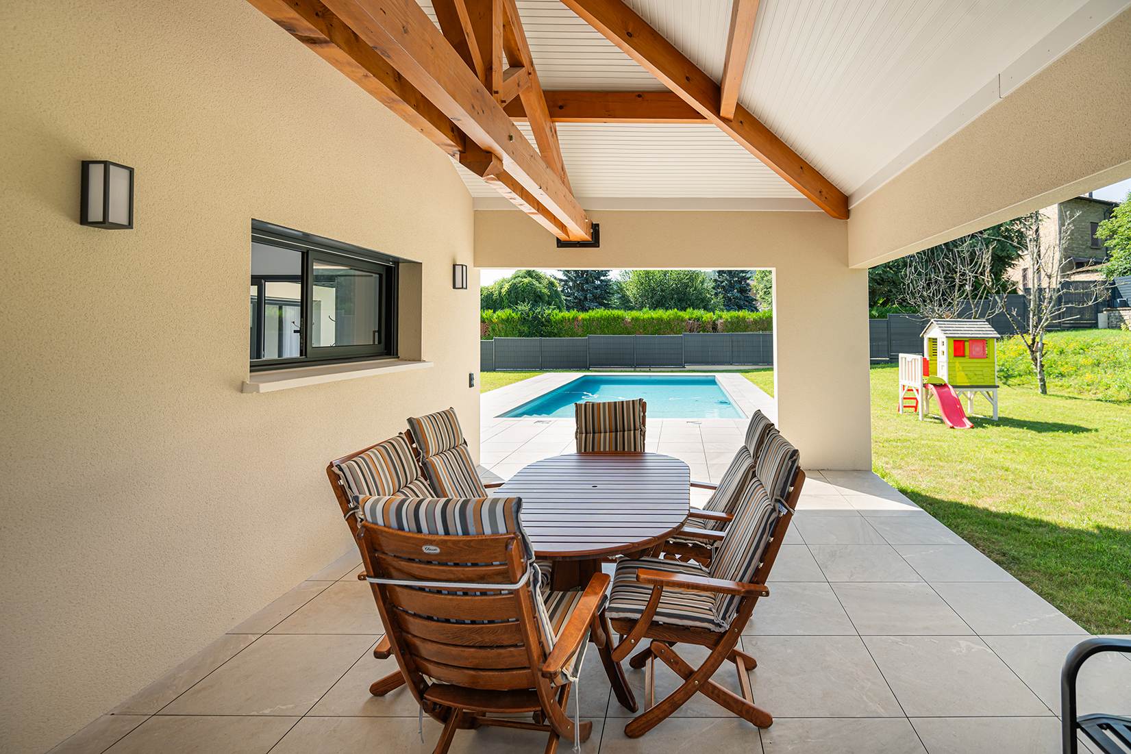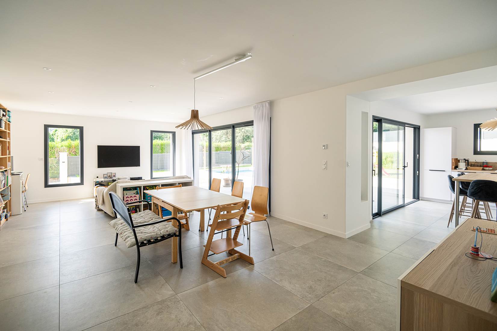 Ce projet de construction de maison individuelle compose une architecture qui apporte un grand confort de vie, une grande luminosité au sein de la maison et qui s’ouvre largement sur la vie extérieure. Les espaces sont généreux afin d’abriter une grande famille. Les nombreux rangements, tant au sein de la maison, avec les nombreux placards et pièces de rangements annexes, qu’à l’extérieur, à travers plusieurs locaux qui peuvent abriter le mobilier extérieur, garantissent un confort de vie pratique et paisible. Les nombreuses chambres et salles de bains permettent d’accueillir confortablement tous les habitants de cette maison y compris les occupants temporaires. Les volumes cette maison s’adaptent ainsi à ce terrain possédant une légère déclivité et optimisent au maximum les espaces de vie autant à l’intérieur qu’à l’extérieur. Les espaces annexes, tels que le garage et la terrasse couverte, sont également généreux de façon à répondre à tous les besoins. Le bassin de la piscine participe également à ce confort de vie et cette sérénité que propose cette architecture contemporaine.