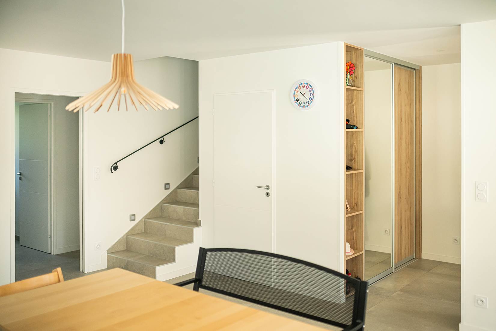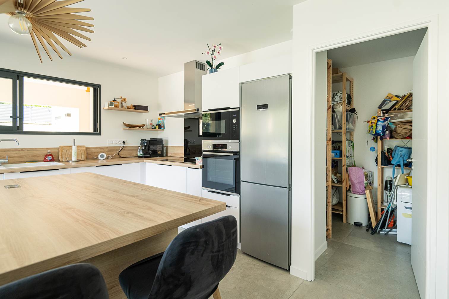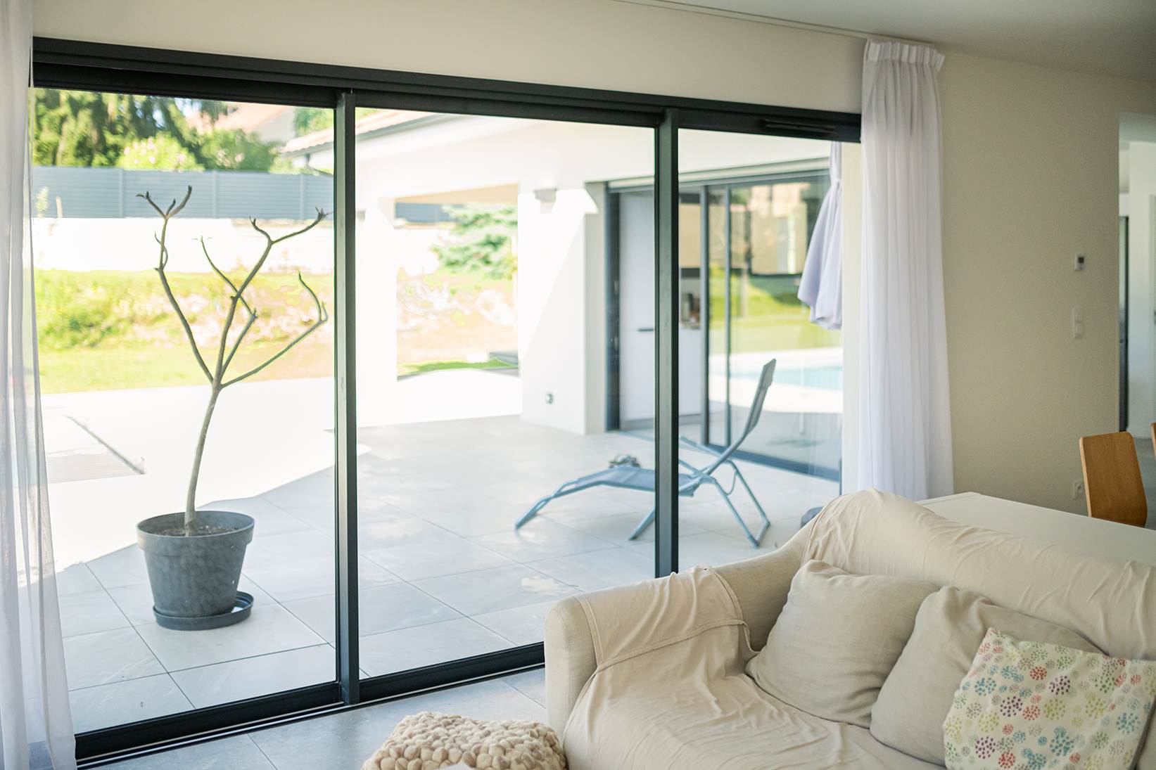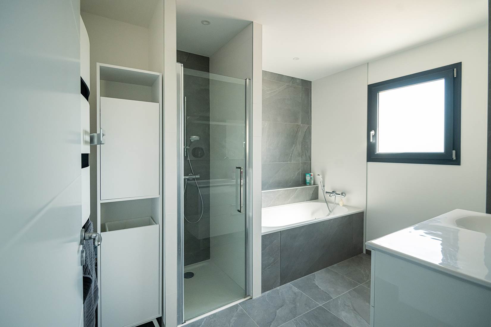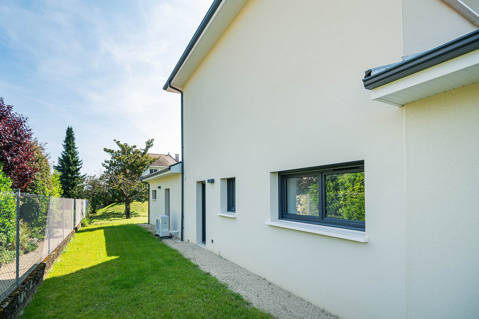 Ce projet de construction de maison individuelle compose une architecture qui apporte un grand confort de vie, une grande luminosité au sein de la maison et qui s’ouvre largement sur la vie extérieure. Les espaces sont généreux afin d’abriter une grande famille. Les nombreux rangements, tant au sein de la maison, avec les nombreux placards et pièces de rangements annexes, qu’à l’extérieur, à travers plusieurs locaux qui peuvent abriter le mobilier extérieur, garantissent un confort de vie pratique et paisible. Les nombreuses chambres et salles de bains permettent d’accueillir confortablement tous les habitants de cette maison y compris les occupants temporaires. Les volumes cette maison s’adaptent ainsi à ce terrain possédant une légère déclivité et optimisent au maximum les espaces de vie autant à l’intérieur qu’à l’extérieur. Les espaces annexes, tels que le garage et la terrasse couverte, sont également généreux de façon à répondre à tous les besoins. Le bassin de la piscine participe également à ce confort de vie et cette sérénité que propose cette architecture contemporaine.