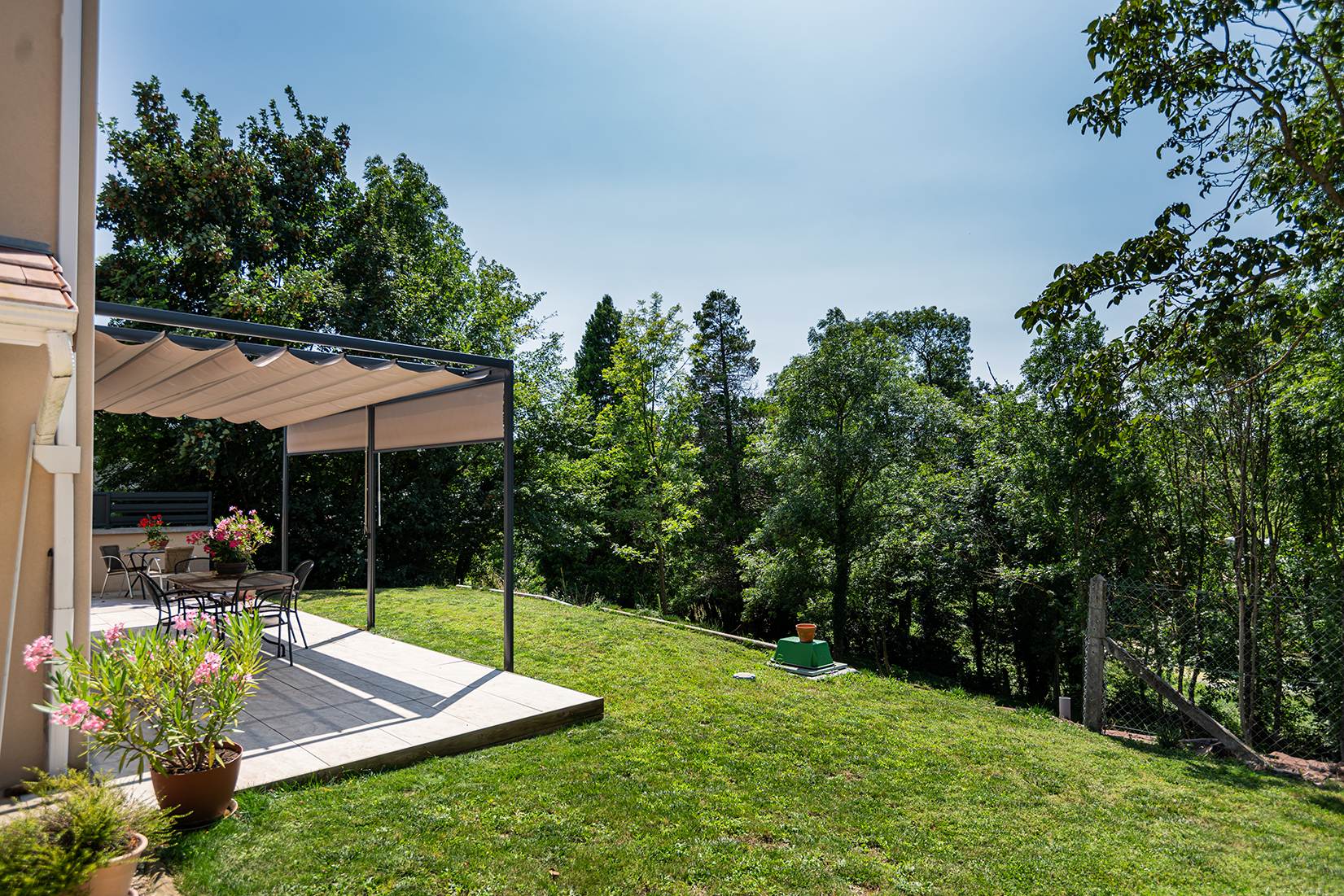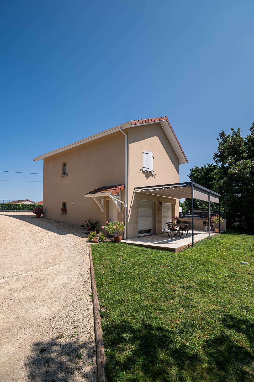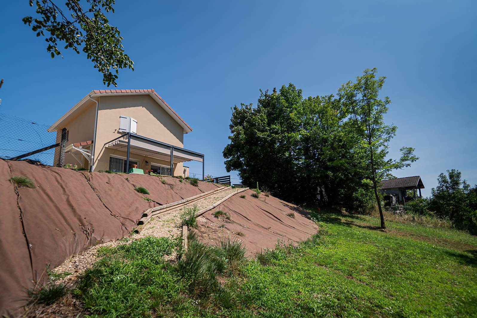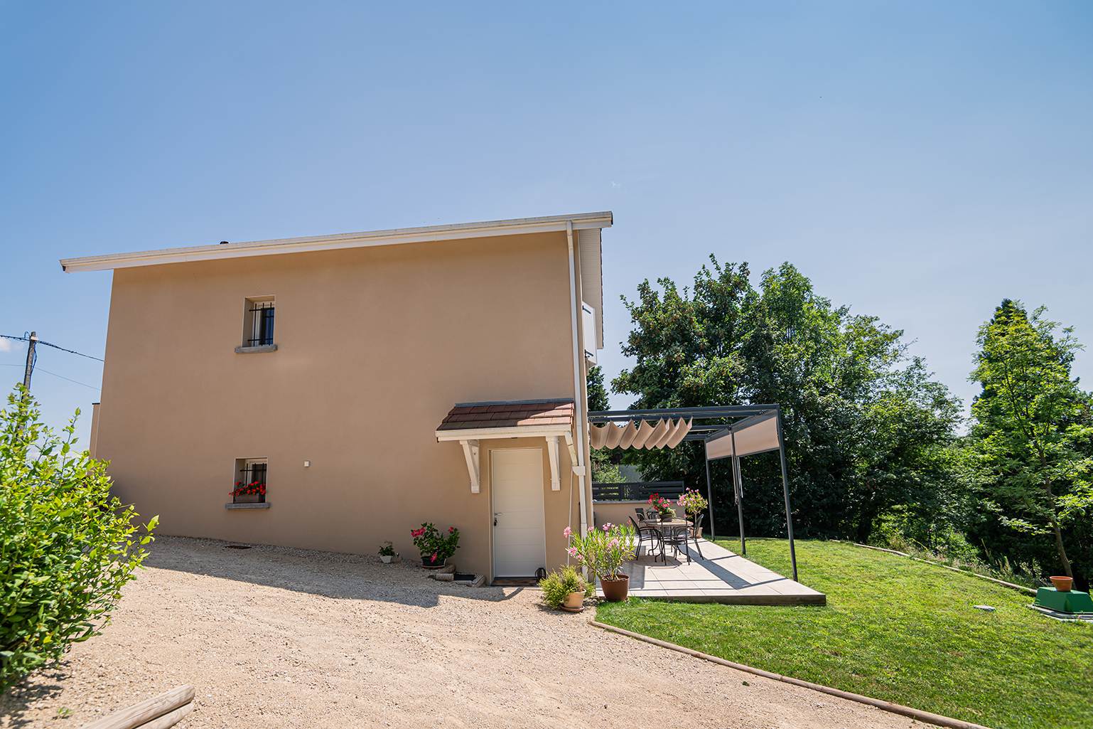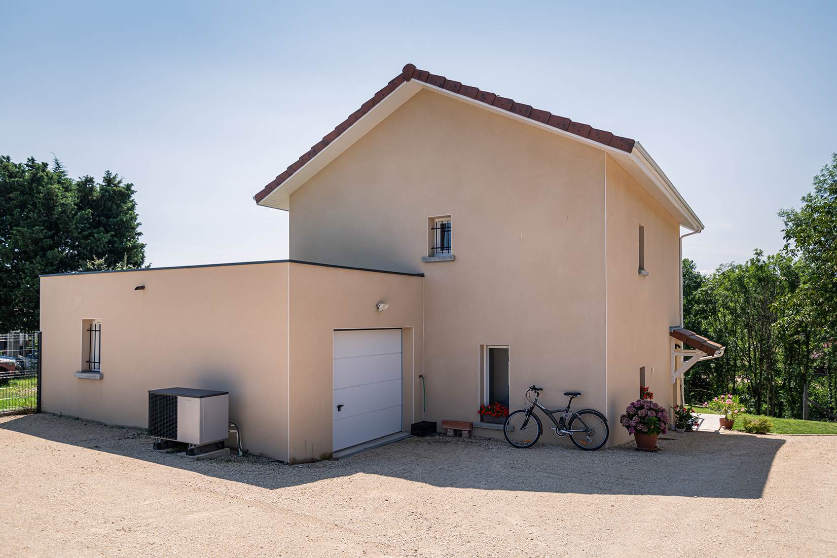 Ce projet de construction de maison individuelle s’ajuste ici parfaitement à la petite surface de ce terrain constructible. Entre la pente du terrain, une zone non constructible, une voie d’accès commune à une maison existante, ainsi que l’installation sur le terrain d’un assainissement individuel pour ce projet, la surface constructible possible pour cette maison était très limitée. Le projet exploite également toutes les possibilités urbanistiques afin d’optimiser les volumes construits. Cette habitation d’une centaine de mètres carrés se développe ainsi sur deux niveaux. Le garage en demi-niveau par rapport à l’habitation s’adapte à la déclivité du site. Les pièces nobles s’orientent principalement face aux orientations lumineuses et s’ouvrent également à la belle vue que possède ce terrain en pente. Les ouvertures de cette maison préservent également au maximum l’intimité de cette petite habitation afin de garantir un minium de vis-à-vis avec l’accès commun ou les parcelles avoisinantes.