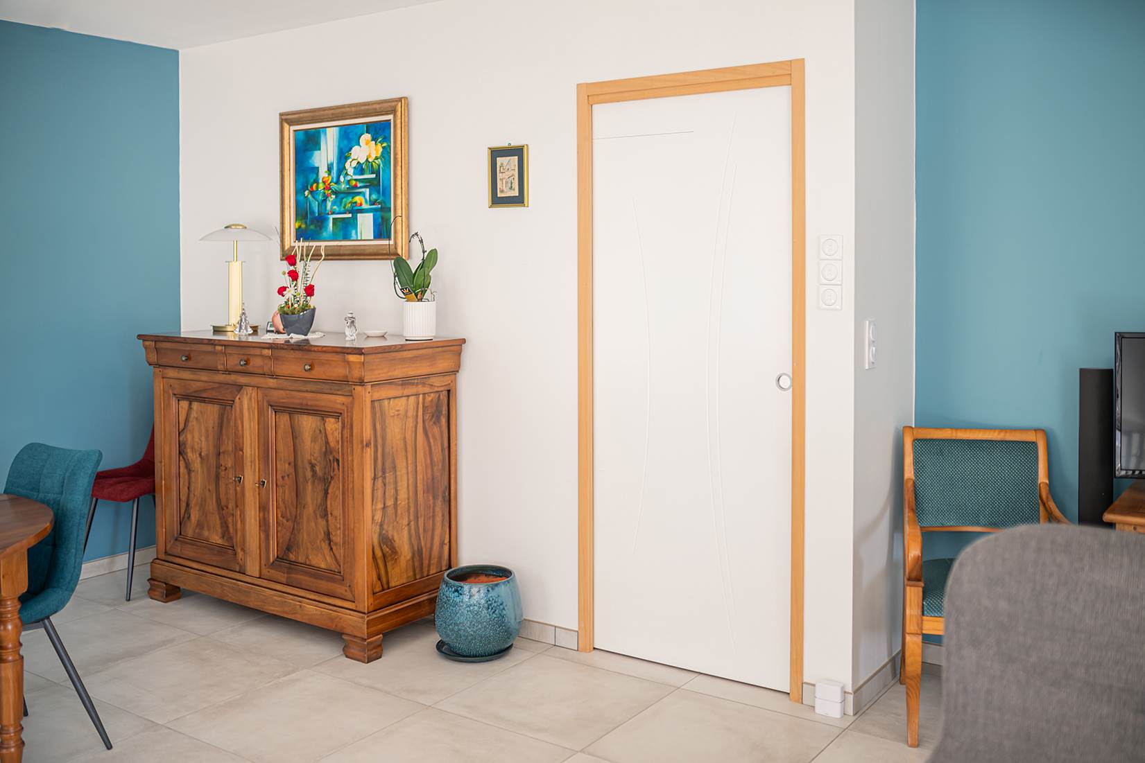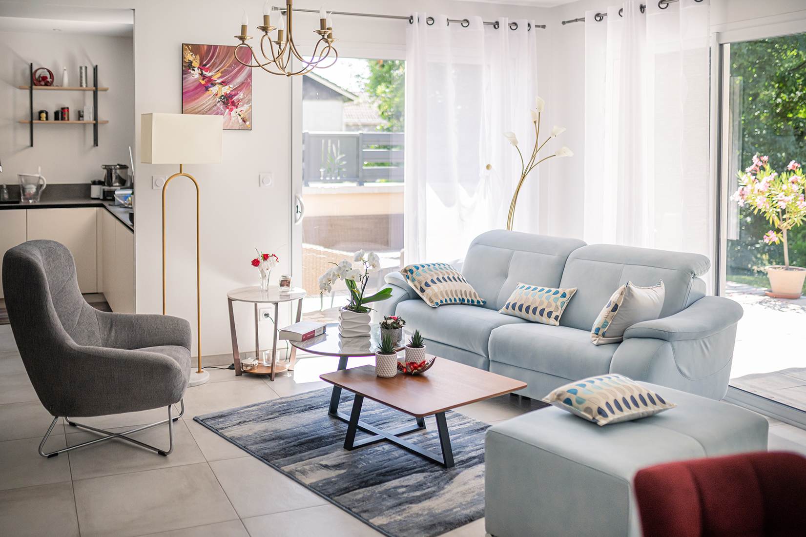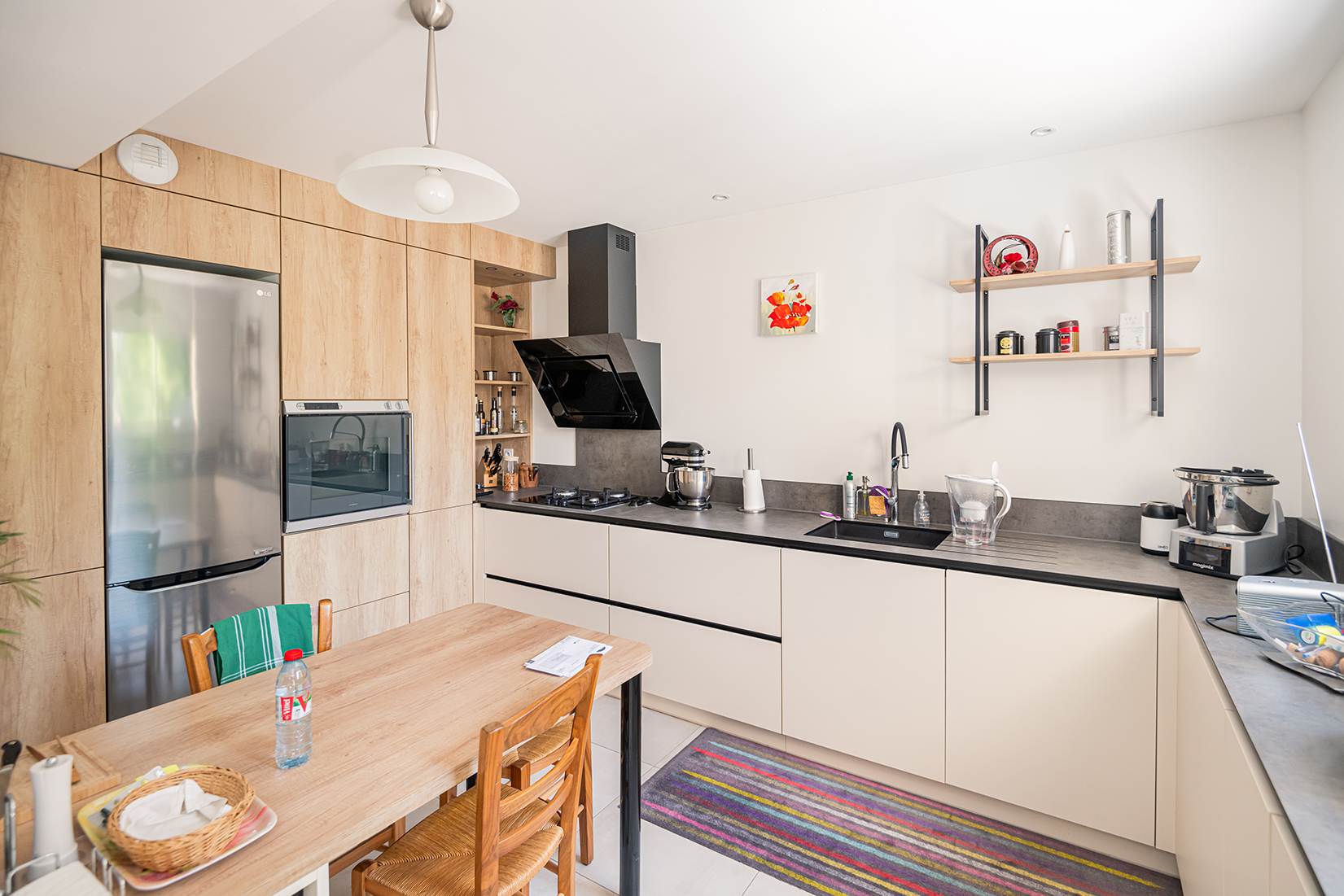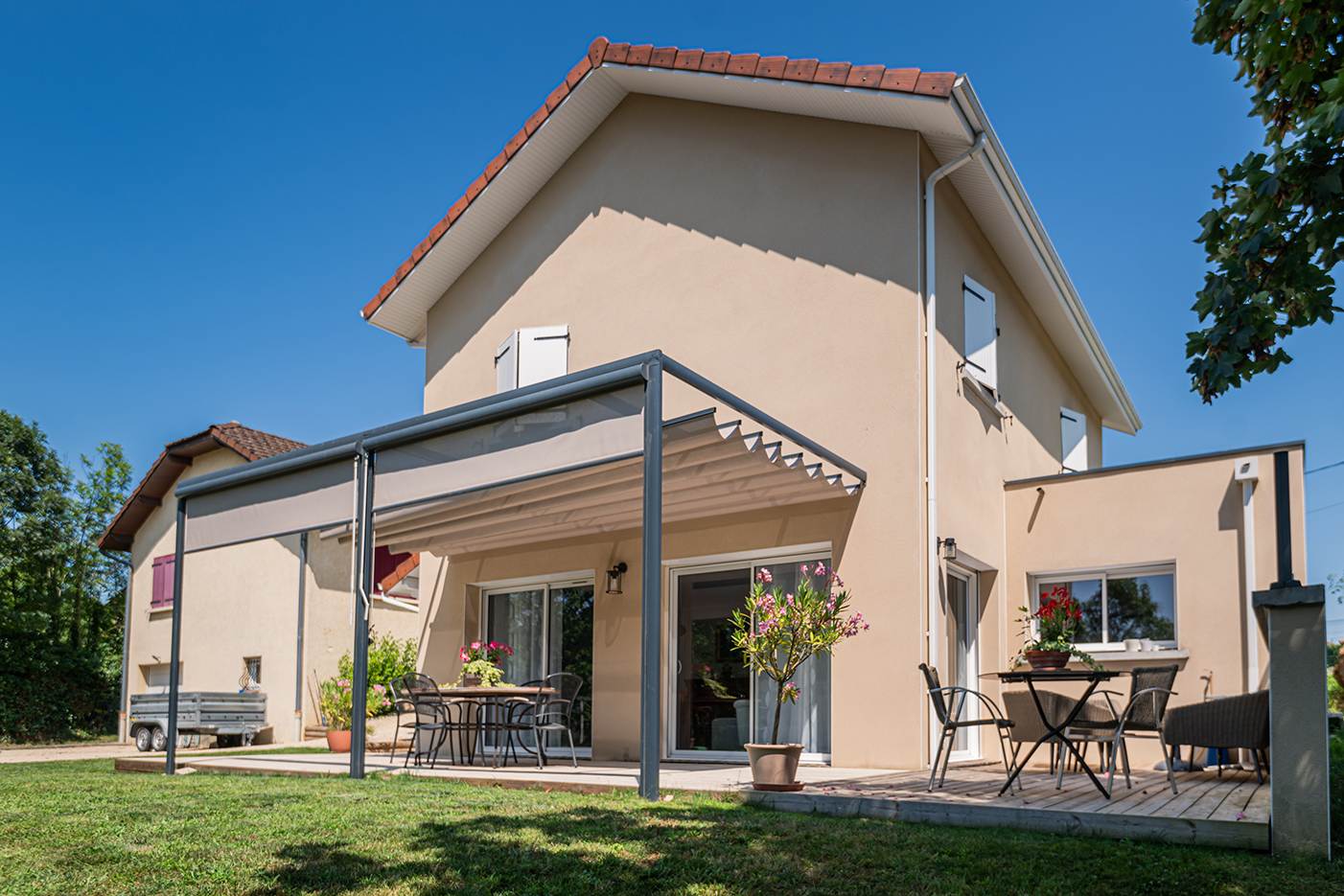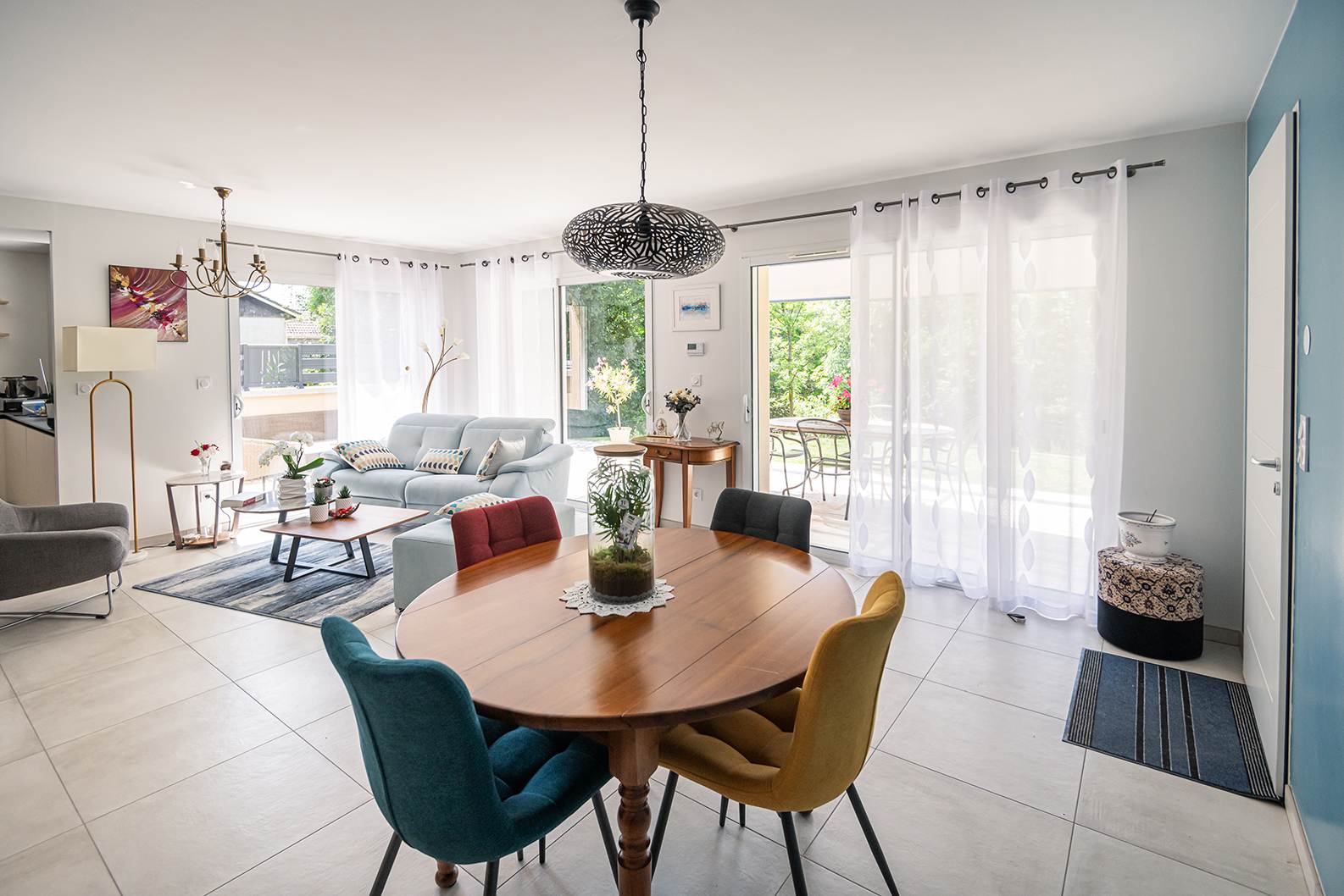 Ce projet de construction de maison individuelle s’ajuste ici parfaitement à la petite surface de ce terrain constructible. Entre la pente du terrain, une zone non constructible, une voie d’accès commune à une maison existante, ainsi que l’installation sur le terrain d’un assainissement individuel pour ce projet, la surface constructible possible pour cette maison était très limitée. Le projet exploite également toutes les possibilités urbanistiques afin d’optimiser les volumes construits. Cette habitation d’une centaine de mètres carrés se développe ainsi sur deux niveaux. Le garage en demi-niveau par rapport à l’habitation s’adapte à la déclivité du site. Les pièces nobles s’orientent principalement face aux orientations lumineuses et s’ouvrent également à la belle vue que possède ce terrain en pente. Les ouvertures de cette maison préservent également au maximum l’intimité de cette petite habitation afin de garantir un minium de vis-à-vis avec l’accès commun ou les parcelles avoisinantes.